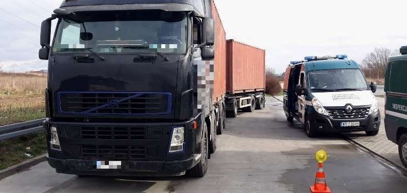 68 t zamiast dopuszczalnych 40 ważyła ciężarówka z przyczepą, która przewoziła skóry w dwóch kontenerach morskich. Przeładowany samochód miał też usterki techniczne, a kierowca nie zawsze rejestrował aktywności na swojej karcie i dopuścił się naruszeń norm czasu pracy.