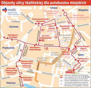 Miejski Zarząd Dróg i Komunikacji informuje, że w związku z przebudową ulicy Idalińskiej, od soboty, 4 października będą zamknięte dla ruchu kołowego odcinki między ulicami Słowackiego a Wyścigową i między Wyścigową a Źródłową. Zostaną wprowadzone objazdy dla autobusów linii 2, 3, 11 i N3 oraz pozostanie utrzymany objazd dla linii 20.
