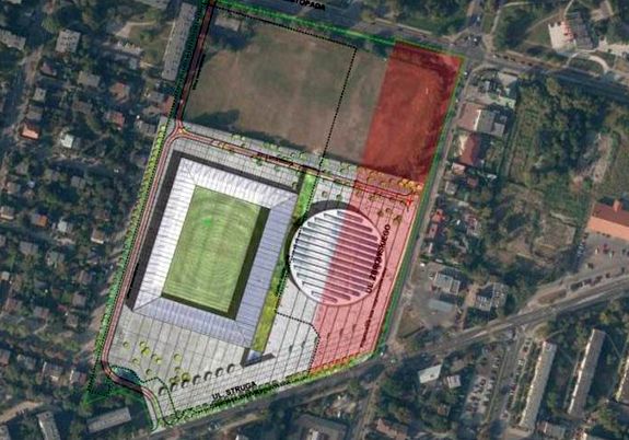 – Poprzednicy rządzący Radomiem pozostawili nam problem. Po prawej stronie (zaznaczone na zdjęciu powyżej kolorem czerwonym) mamy tereny sporne byłych właścicieli. Tu miała być budowana hala. Oczekiwanie na rozstrzygnięcia sądowe dotyczące tych działek może potrać nawet do roku 2018. Musieliśmy podejmować szybkie decyzje dające szansę na ruszenie z budową hali. Będzie ona budowana od ul. Struga na dużej części placu targowego i stadionu piłkarskiego. Stadion według naszej koncepcji zostanie odwrócony na linię wschód - zachód – tłumaczy prezydent Radosław Witkowski.