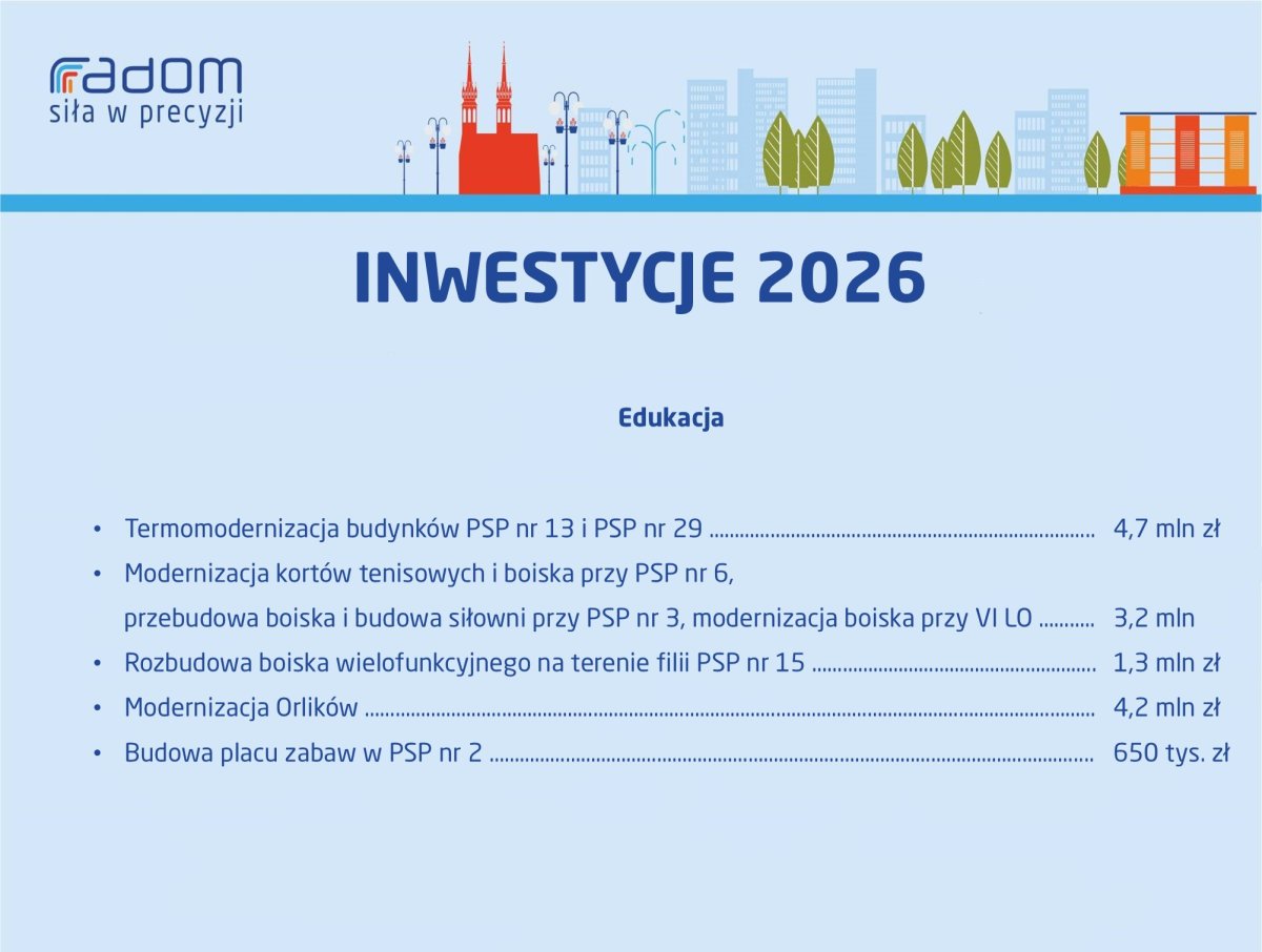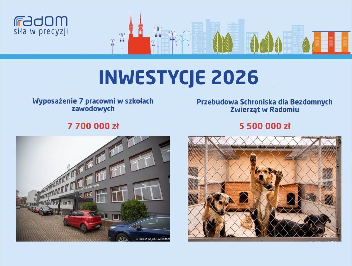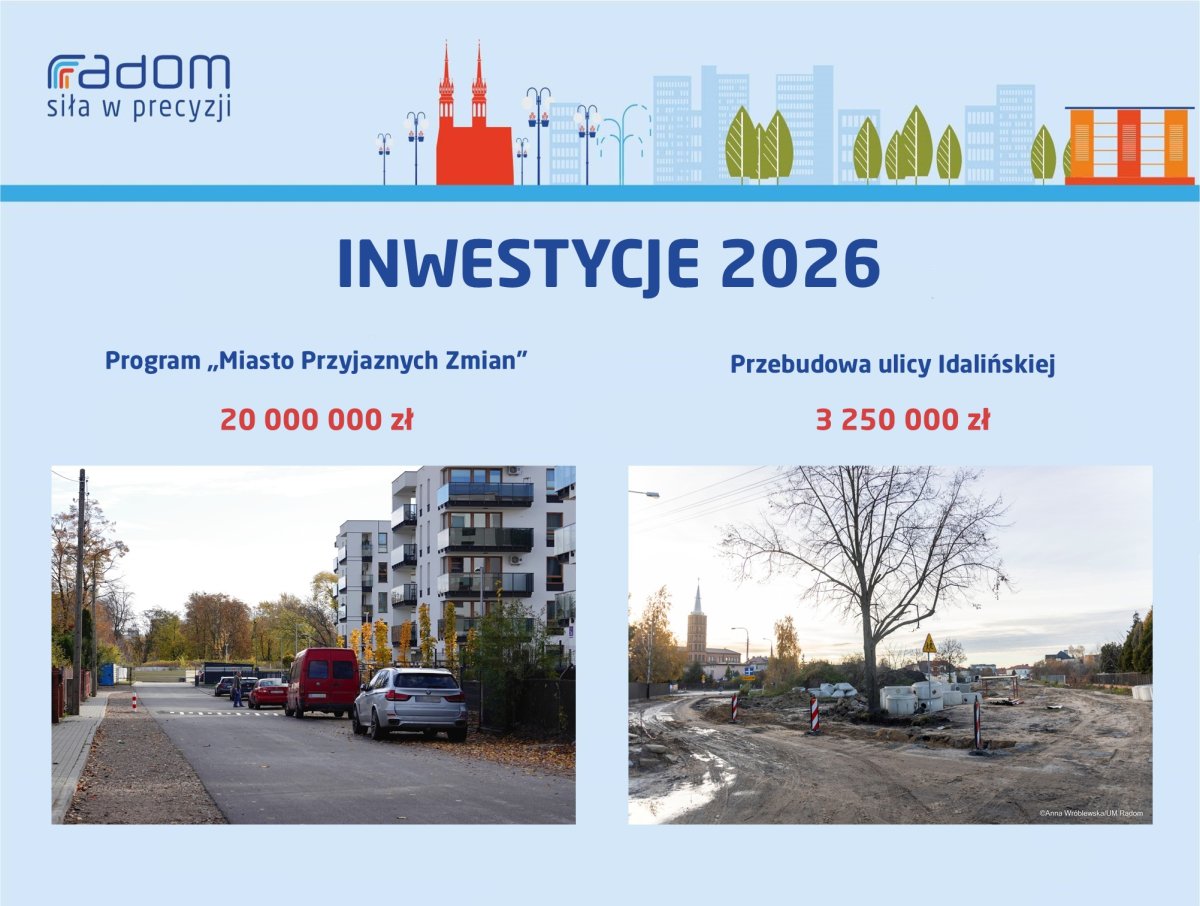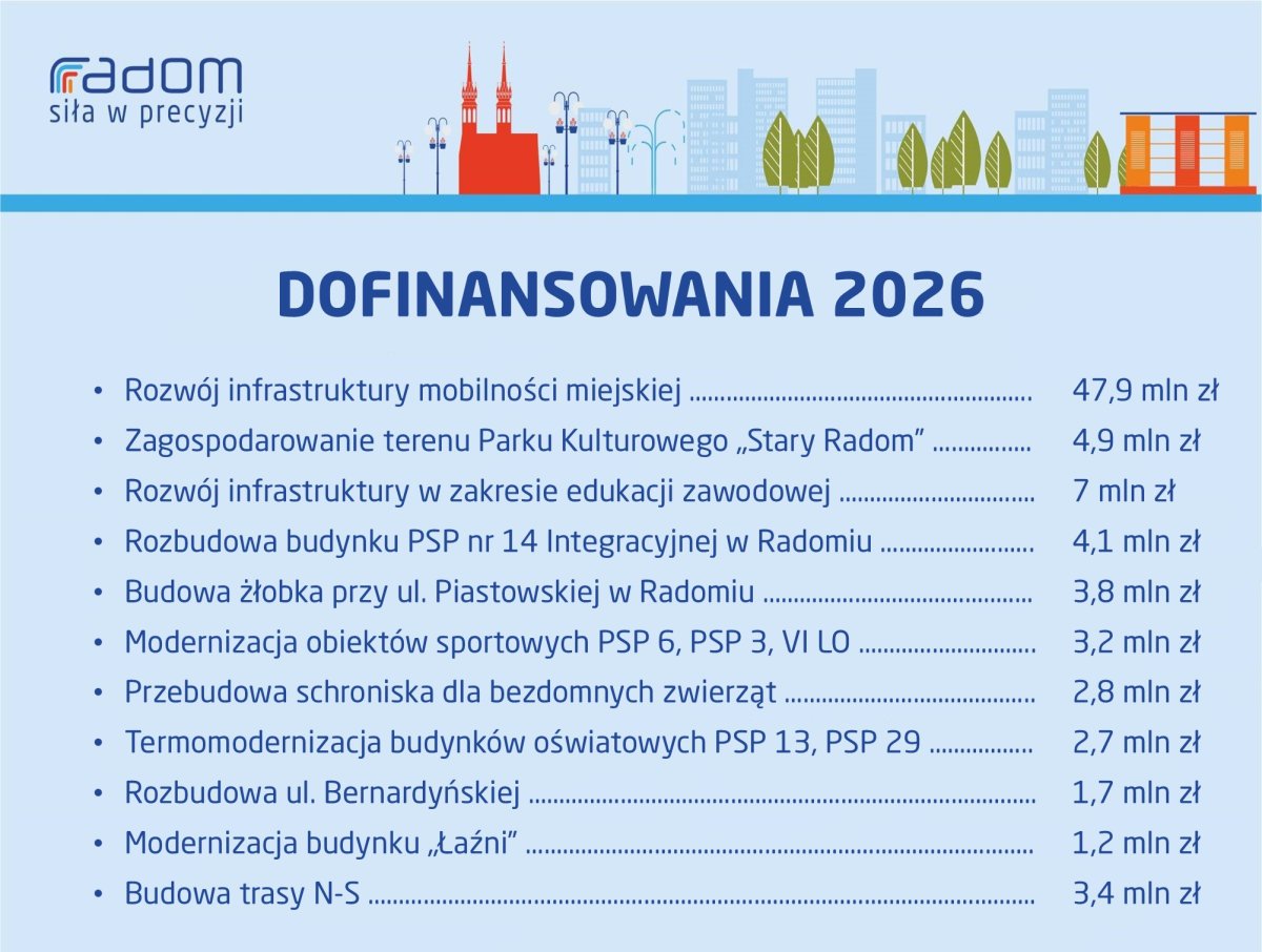 Miasto pozyskuje również coraz więcej środków zewnętrznych. W 2026 roku Radom otrzymał dofinansowania m.in. na rozwój infrastruktury mobilności miejskiej, zagospodarowanie Parku Kulturowego „Stary Radom”, przebudowę schroniska dla bezdomnych zwierząt, rozbudowę PSP nr 14 czy rozwój infrastruktury w edukacji zawodowej.
