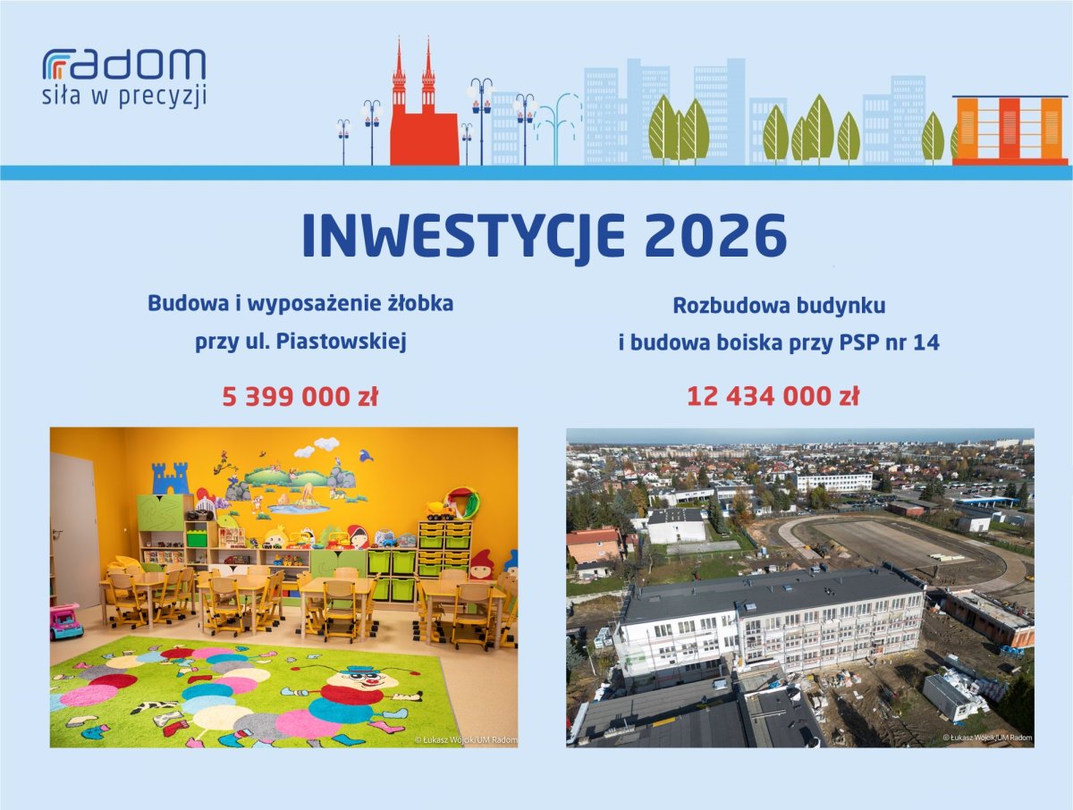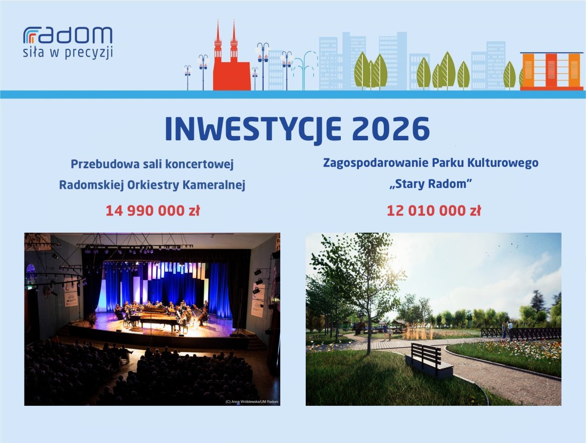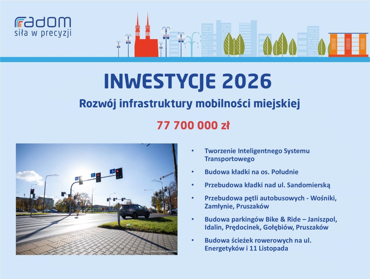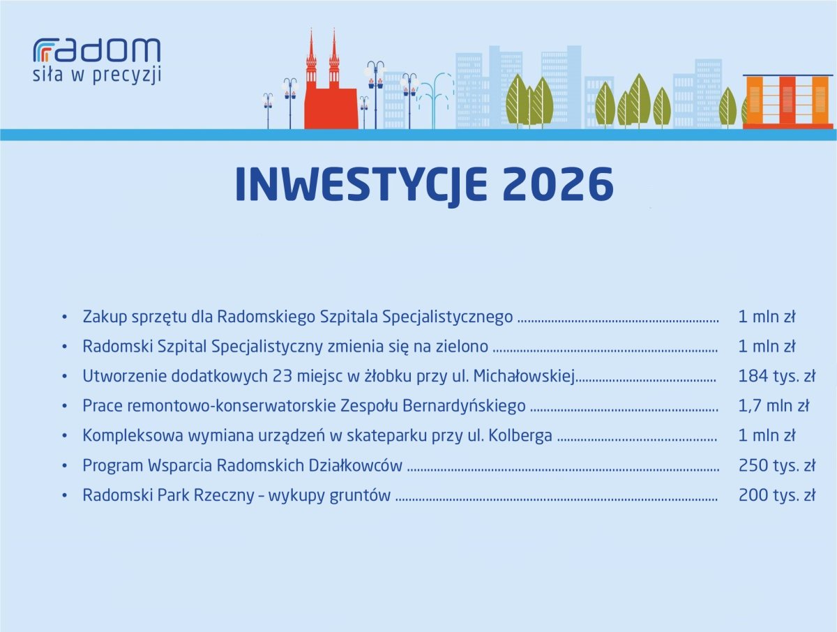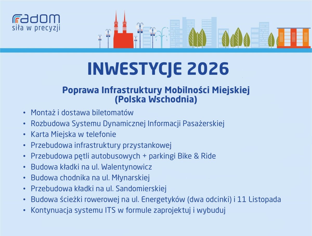 Miasto pozyskuje również coraz więcej środków zewnętrznych. W 2026 roku Radom otrzymał dofinansowania m.in. na rozwój infrastruktury mobilności miejskiej, zagospodarowanie Parku Kulturowego „Stary Radom”, przebudowę schroniska dla bezdomnych zwierząt, rozbudowę PSP nr 14 czy rozwój infrastruktury w edukacji zawodowej.