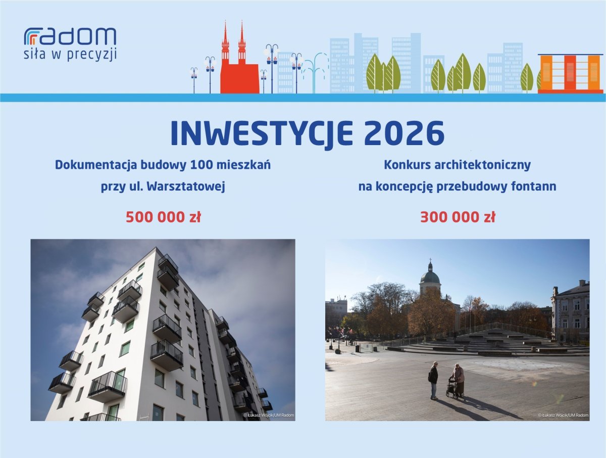 W projekcie budżetu znalazły się także pieniądze na dokumentację budowy 100 mieszkań przy ul. Warsztatowej (500 tys. zł), Centrum Lecznictwa Długoterminowego (1,2 mln zł). Jest też 300 tys. zł na konkurs architektoniczny na koncepcję przebudowy fontann, o co radomianie dopominają się bardzo często i czekają na zmianę od lat. Jednak finału modernizacji  jednego z najbardziej reprezentacyjnych miejsc Radomia możemy spodziewać się dopiero w 2027 r.