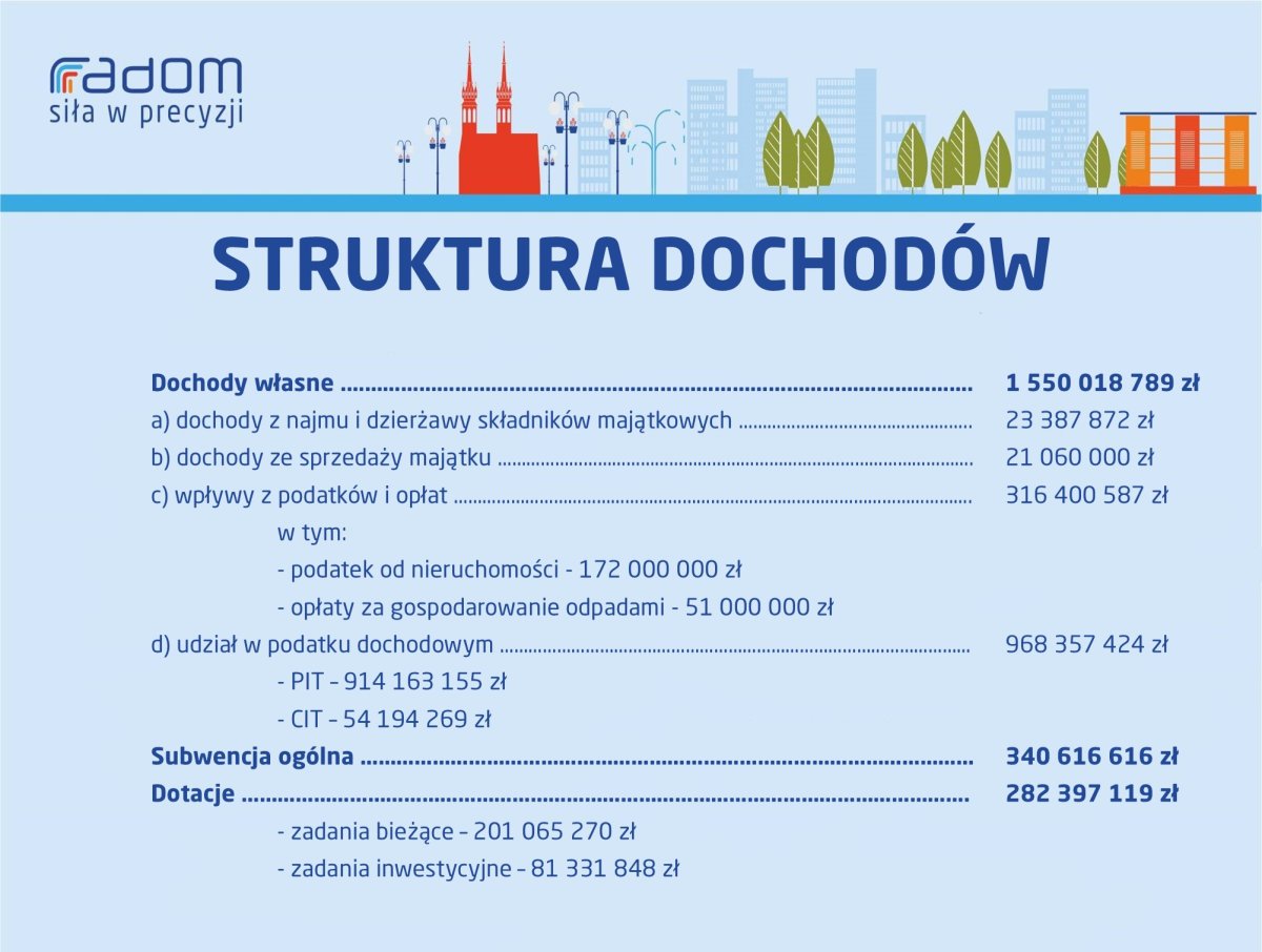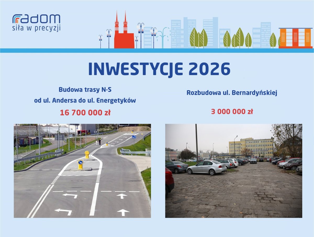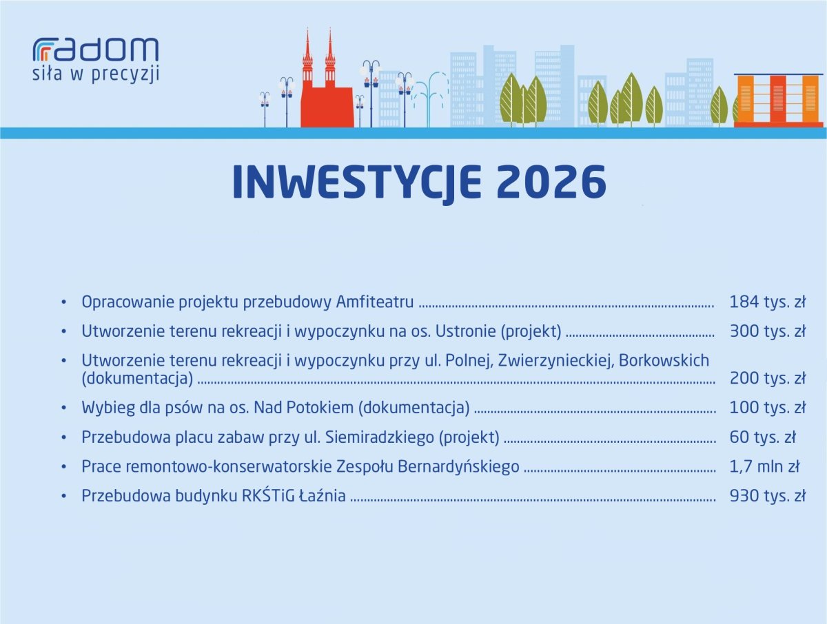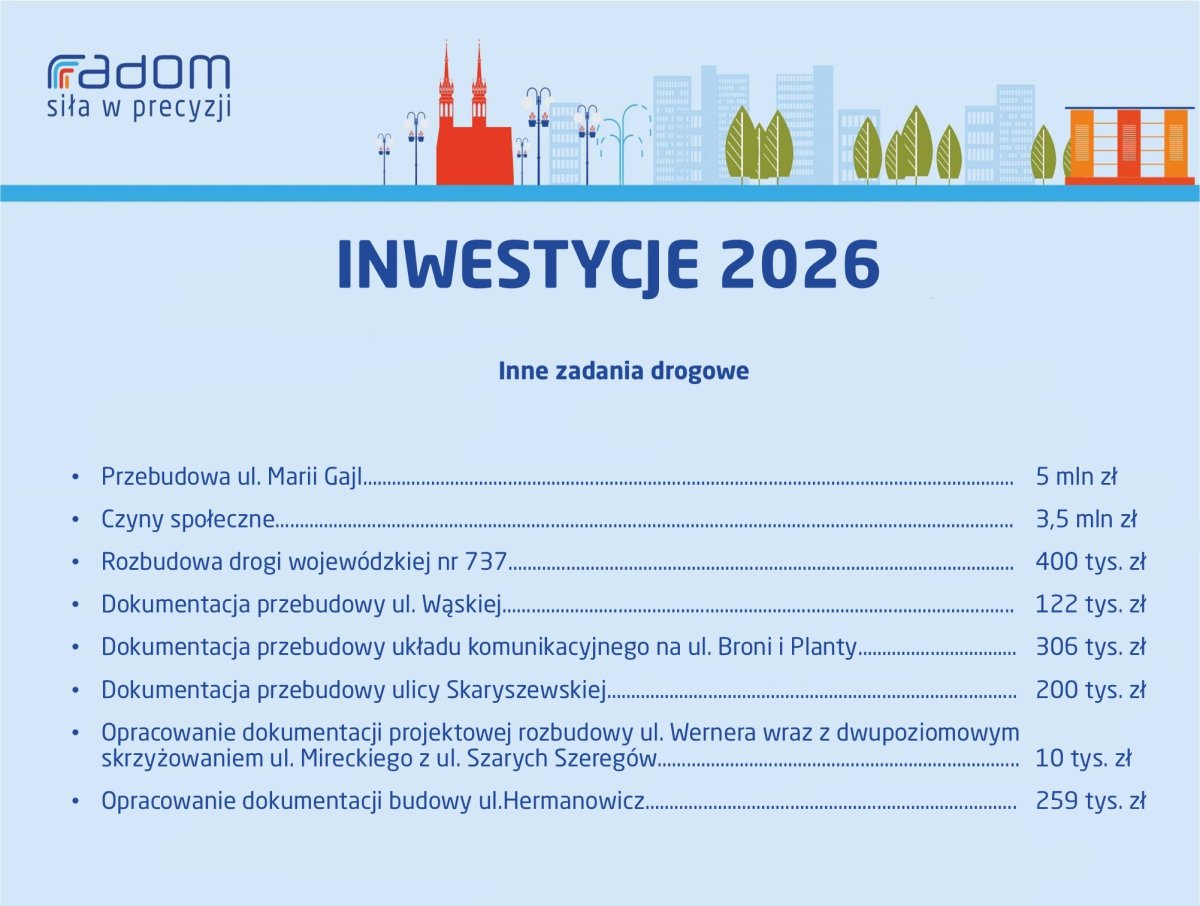 Wśród innych ważnych zadań są m.in. program „Miasto Przyjaznych Zmian” (20 mln zł), budowa trasy N-S od ul. Andersa do ul. Energetyków (16,7 mln zł), przebudowa ul. Idalińskiej (3,25 mln zł), rozbudowa ul. Bernardyńskiej (3 mln zł), przebudowa sali koncertowej Radomskiej Orkiestry Kameralnej (prawie 15 mln zł), zagospodarowanie Parku Kulturowego „Stary Radom” (ponad 12 mln zł), rozbudowa budynku i budowa boiska przy PSP nr 14 (prawie 12,5 mln zł), budowa i wyposażenie żłobka przy ul. Piastowskiej (niespełna 5,4 mln zł), budowa Szpitalnego Oddziału Ratunkowego (8,3 mln zł), utworzenie i wyposażenie Centrum Opiekuńczo-Mieszkalnego (2,9 mln zł) czy przebudowa Schroniska dla Bezdomnych Zwierząt (5,5 mln zł).