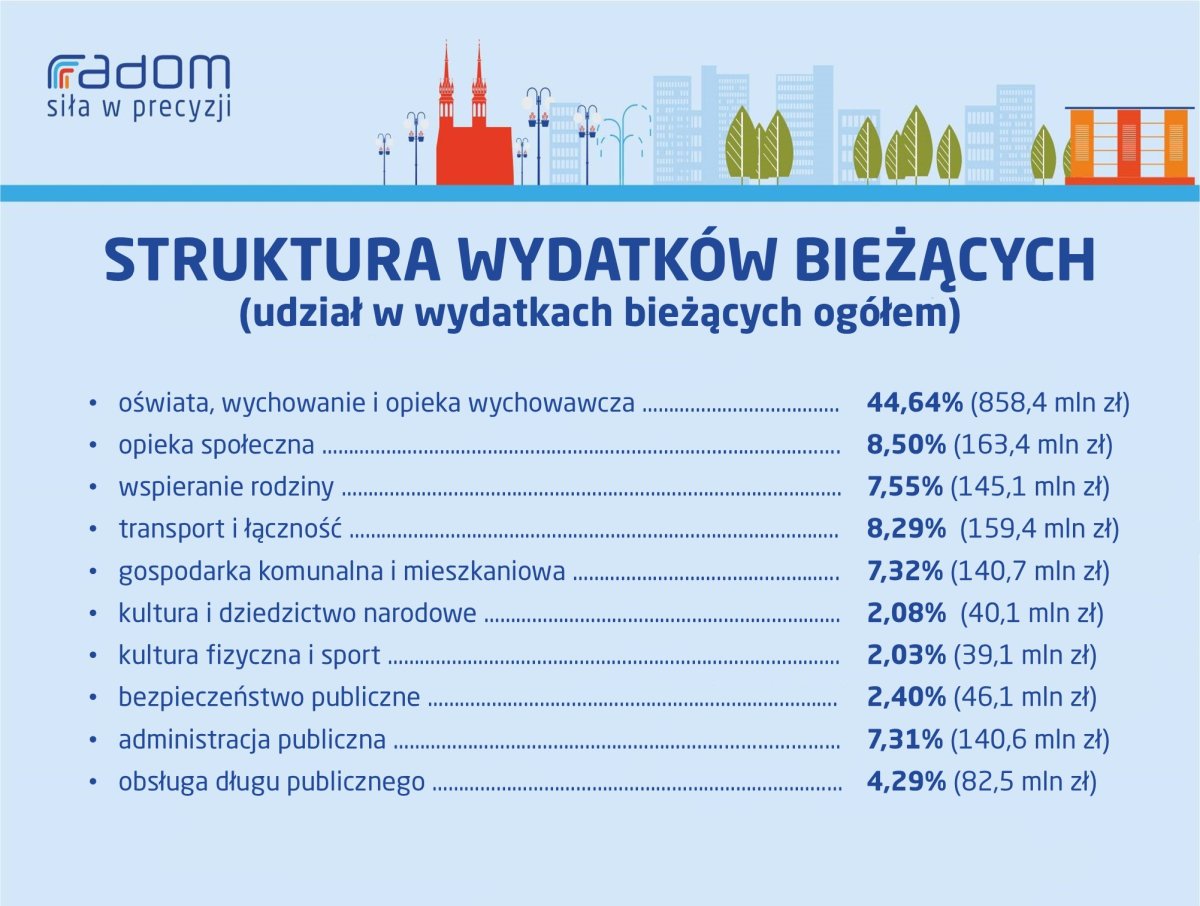 Projekt zakłada dochody miasta na poziomie 2,03 mld zł, a wydatki - 2,13 mld zł. W strukturze wydatków największą część stanowią: oświata, wychowanie i opieka wychowawcza – 858,4 mln zł (44,64 proc.), opieka społeczna – 163,4 mln zł (8,5 proc.%), transport i łączność – 159,4 mln zł (8,29 proc.) oraz wspieranie rodziny – 145,1 mln zł (7,55 proc.).