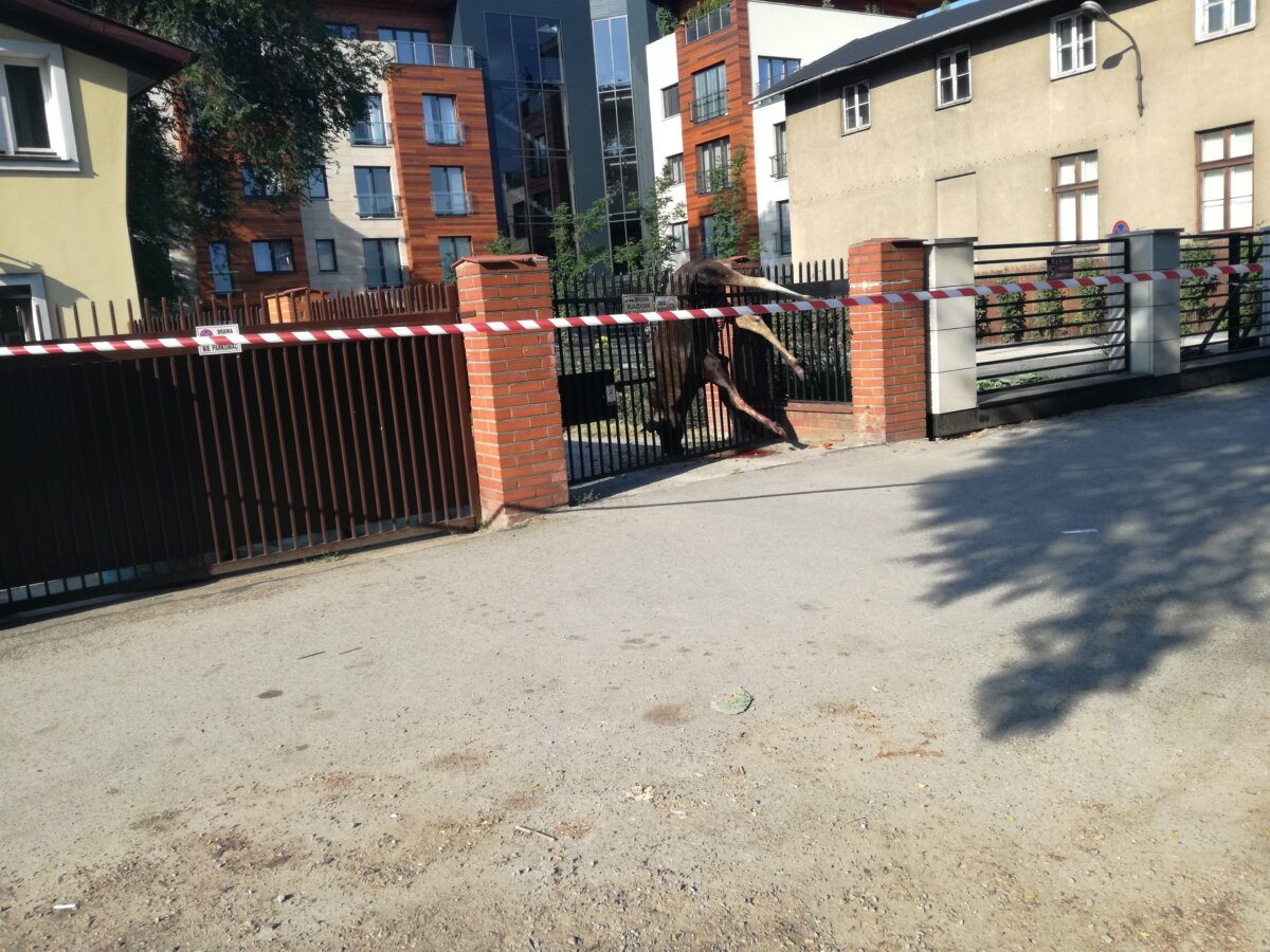 Dramat dzikiego zwierzęcia. Łoś zawisł na ogrodzeniu posesji przy ul. Okulickiego. Strażnikom miejskim nie udało się go uratować, młody byczek stracił życie.