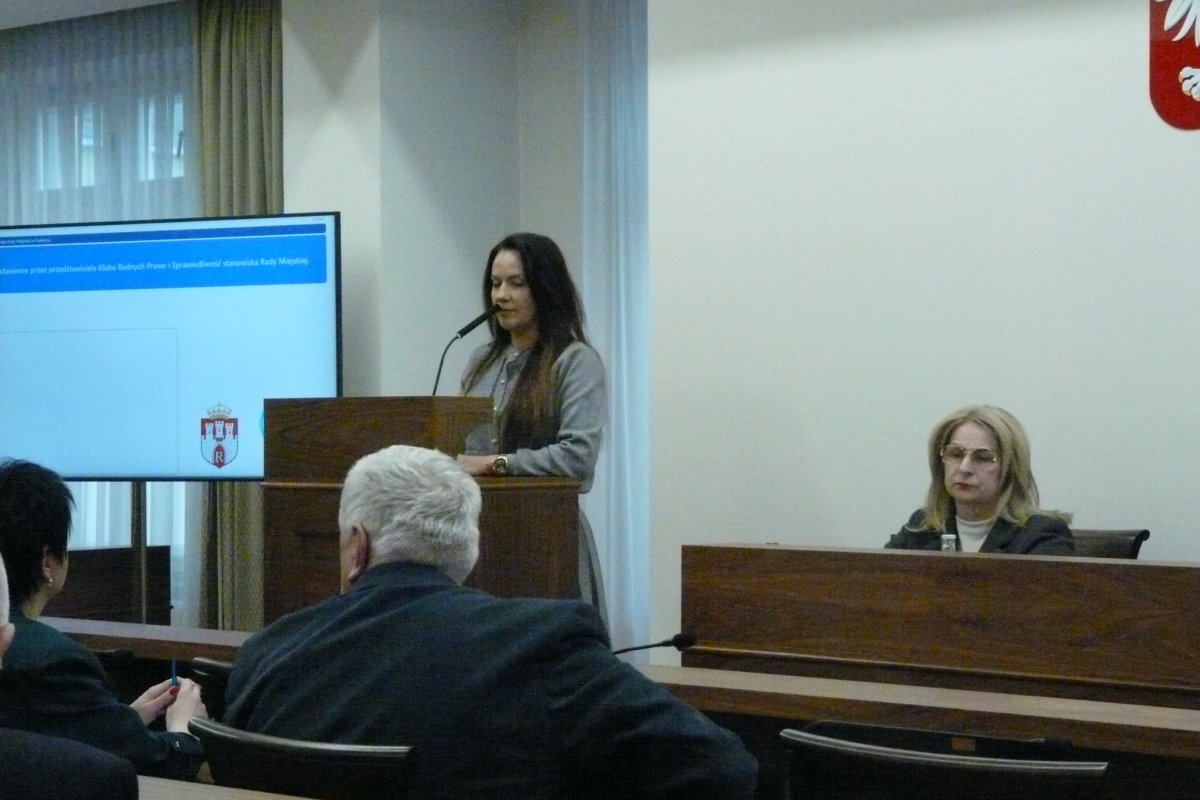 Na początku tekst stanowiska rady miejskiej przygotowaną przez klub PiS przedstawiła Katarzyna Pastuszka-Chrobotowicz. Autorzy domagają się potępienia "potańcówki" i wnioskują o odwołanie ze stanowiska wiceprezydent Michalskiej-Wilk za organizację imprezy, podczas której zrobiła sobie zdjęcia ze statystami przebranymi za zomowców