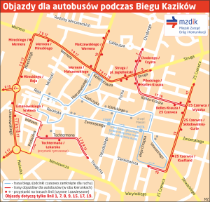 Miejski Zarząd Dróg i Komunikacji informuje, że w związku z organizacją Biegu Kazików w niedzielę, 10 marca w godz. około 12.00-14.25 nastąpią zmiany w ruchu oraz objazdy dla autobusów linii 1, 7, 8, 9, 15, 17, 19 i 25 (dla linii 19 od godz. 12, a dla pozostałych od godz. 12.30).