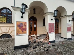 Filary Łaźni uszkodzone. Wjechał w nie pijany i poszukiwany, z zakazami sądowymi prowadzenia pojazdów, kierowca